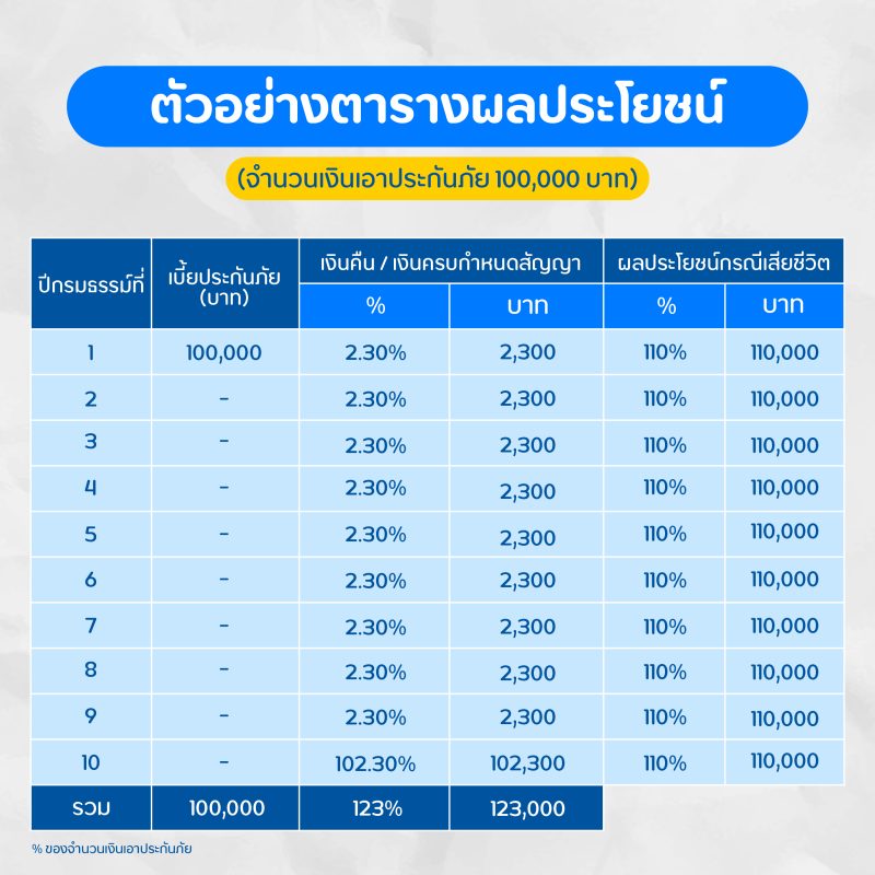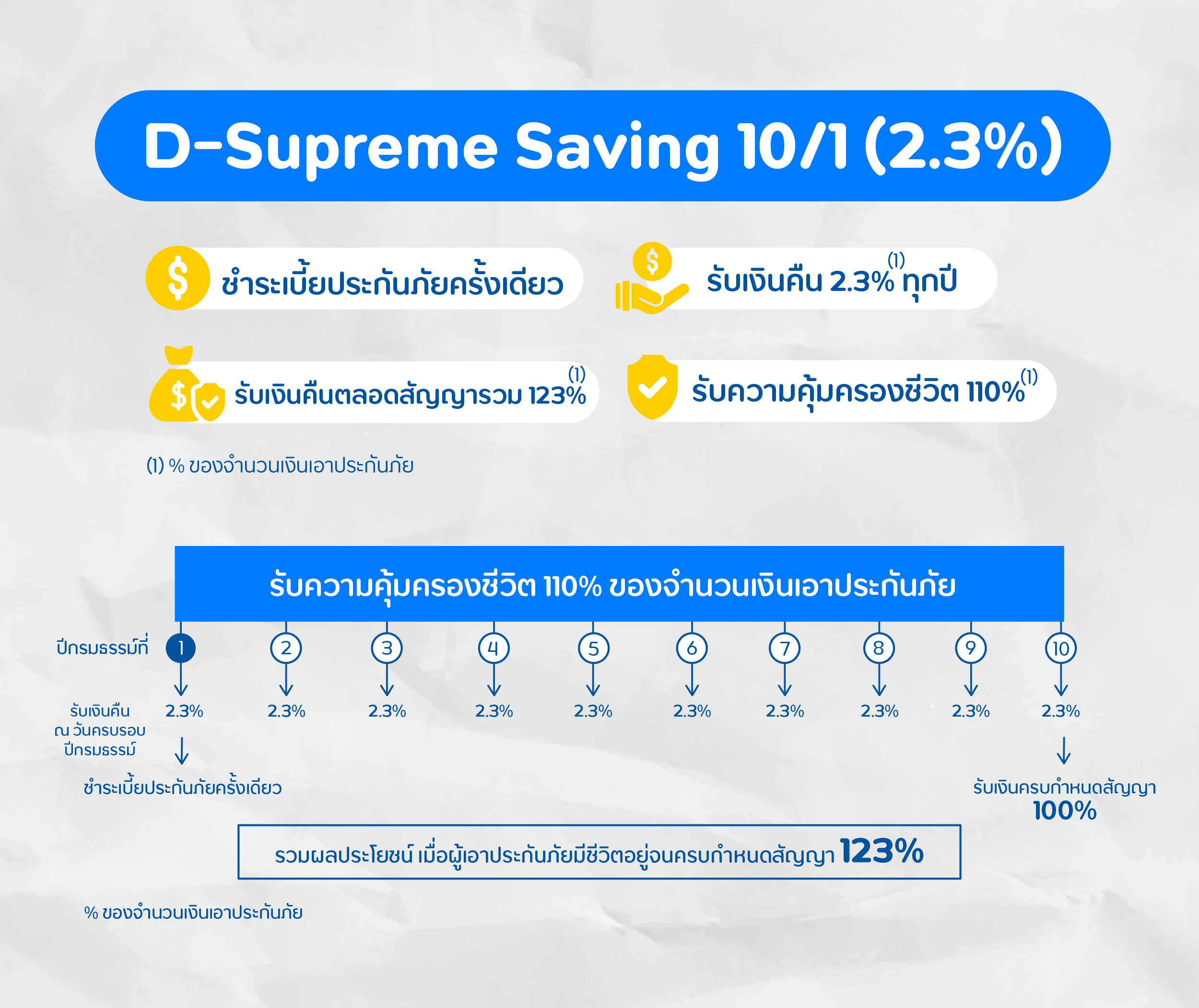 ประกันออมทรัพย์ D-Supreme Saving 10/1 (2.3%) รับเงินคืนตลอดสัญญารวม 123%